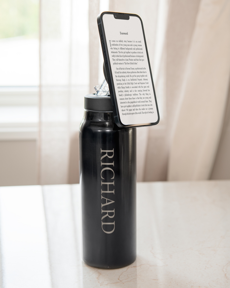 €60Nimikoitu juomapullo ja magneettinen puhelinteline, musta