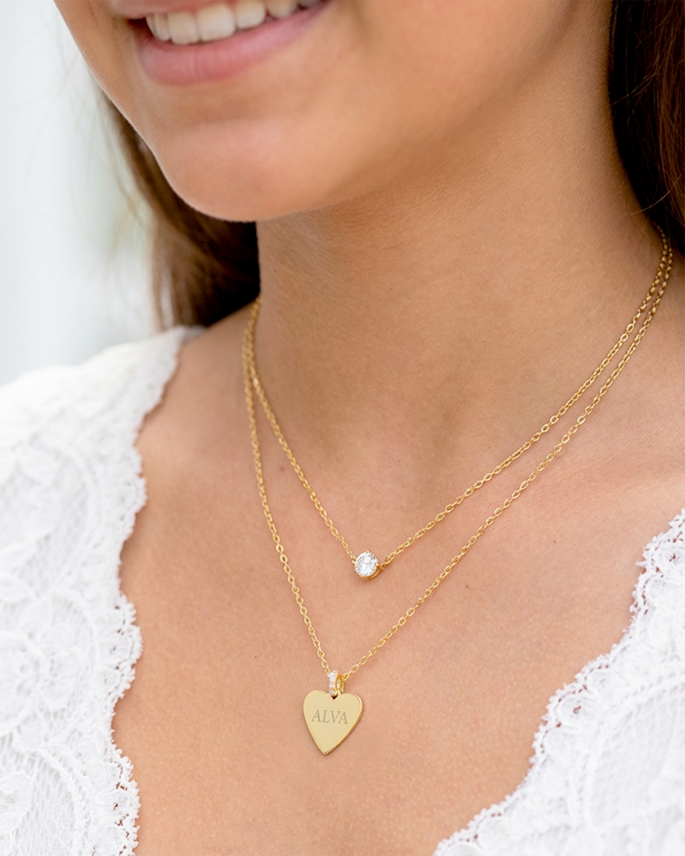 Ensimmäisessä kaulakorussa on kultainen sydän ja säihkyviä strassikiviä, ja koruun kaiverretaan valitsemasi nimi tai nimikirjaimet. Toisessa kaulakorussa on kimalteleva kuutiozirkoniakivi, joka heijastaa valoa ja hohtaa kauniisti.