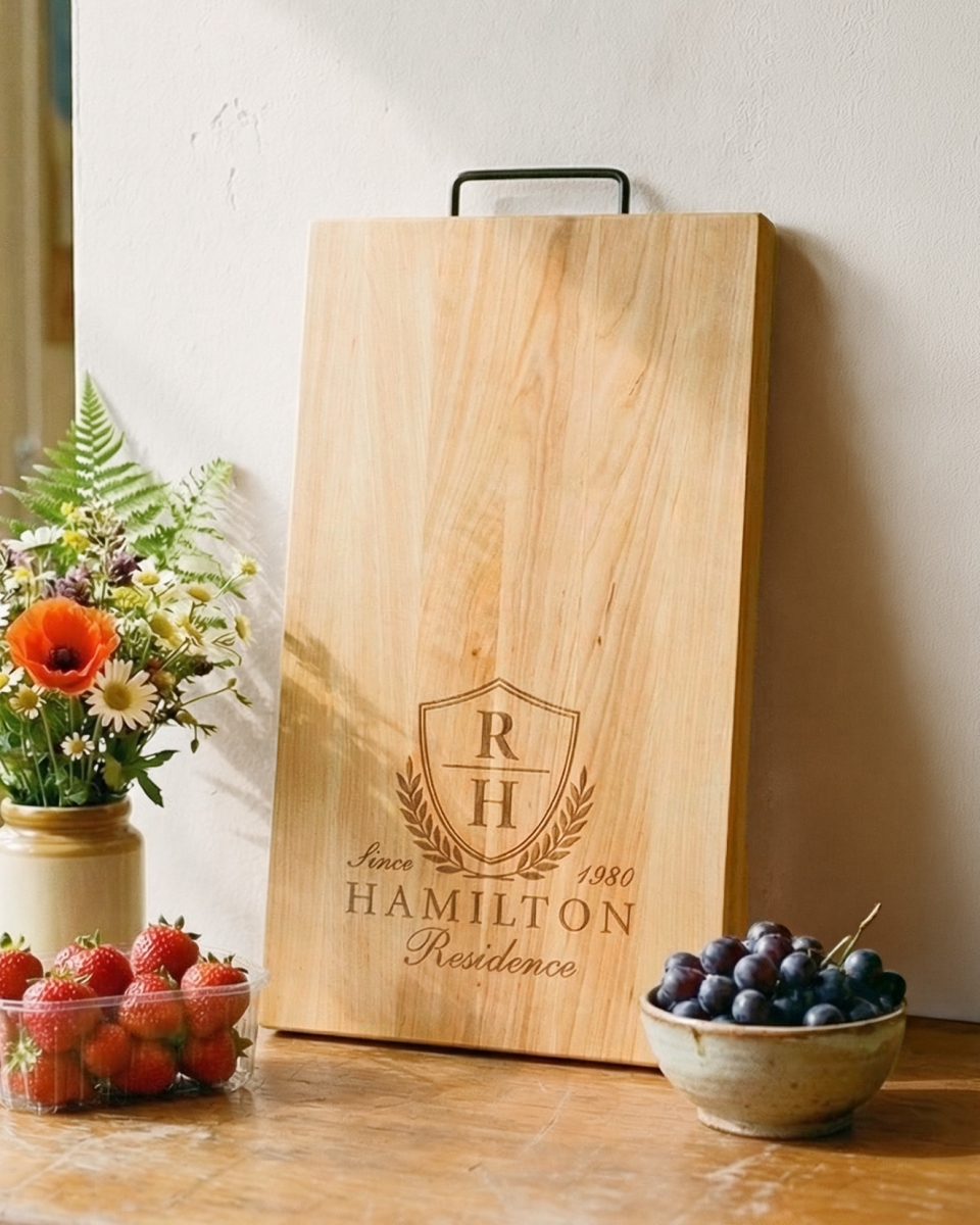 Ylellisestä pähkinäpuusta valmistettu leikkuulauta yksilöllisellä kaiverruksella. Sopii käytännölliseksi tarjoilualustaksi ja tyylikkääksi sisustusesineeksi keittiön pöydälle. Leikkuulaudan toisessa lyhyessä päässä on metallikahva.