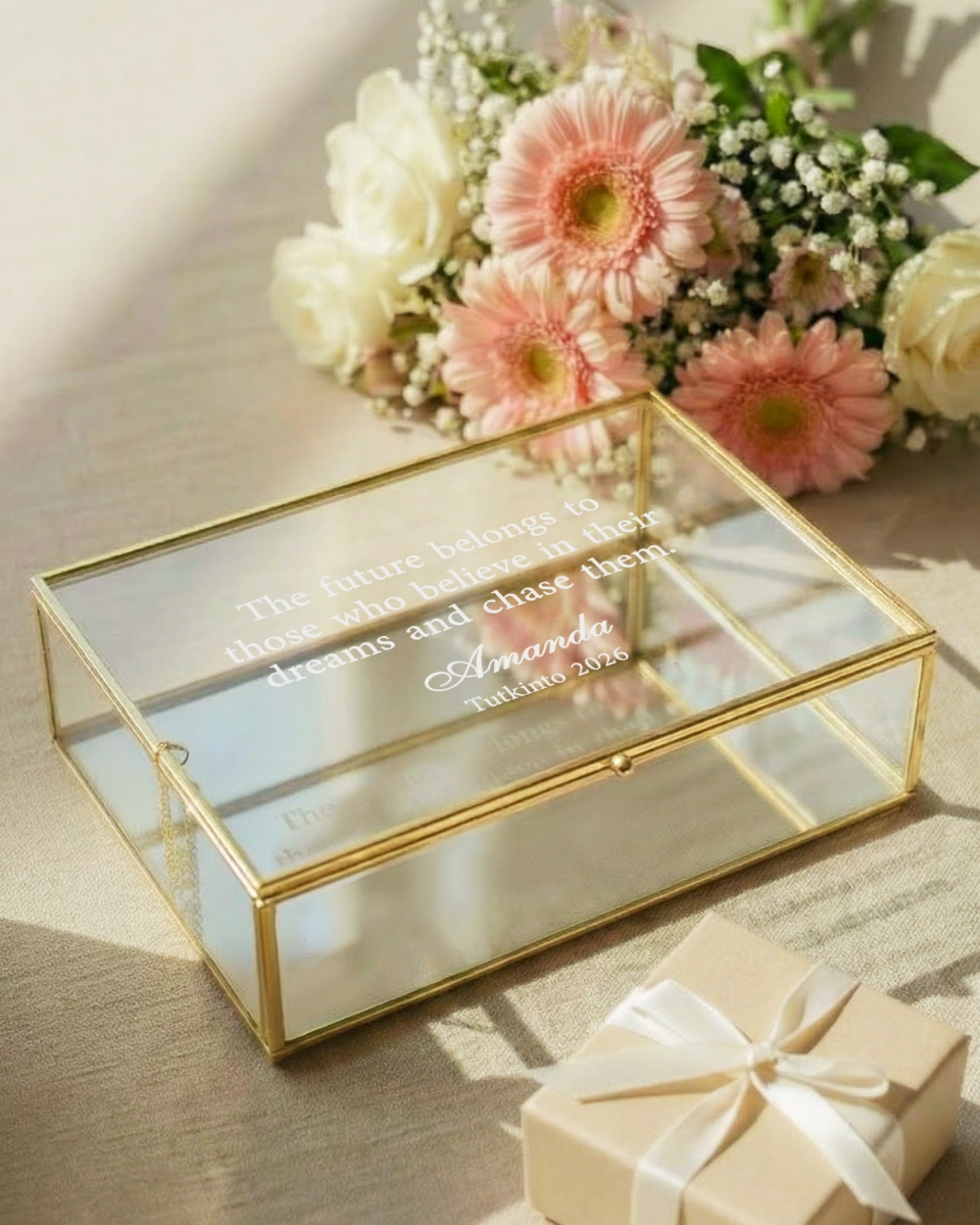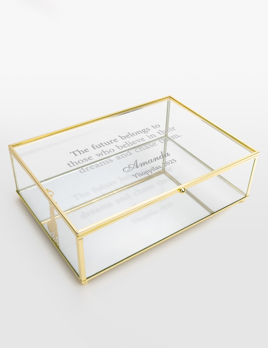Tämä tyylikäs, kauniilla kullanvärisillä yksityiskohdilla ja peilipohjalla varustettu muistolaatikko antaa uuden ulottuvuuden laatikon sisällölle. Lasikanteen kaiverretaan valitsemasi nimi ja henkilökohtainen viesti, joka voi olla innostava lause tai muu muistolaatikosta ainutlaatuisen tekevä erityinen teksti.