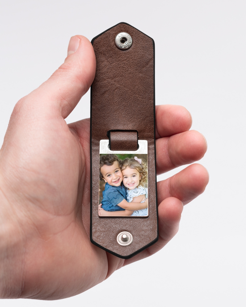 Avaimenperällä on myös tunnearvoa, sillä siihen painetaan valitsemasi kuva – kenties vaikka lastesi kuva? Avaimenperä toimitetaan hienossa kangaspussissa, jonka tyylikäs solki suojaa kuvalaattaa. Voit valita väreistä musta, ruskea tai konjakki.