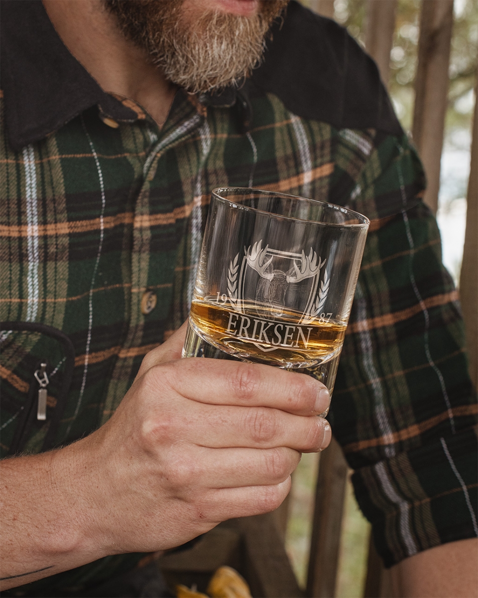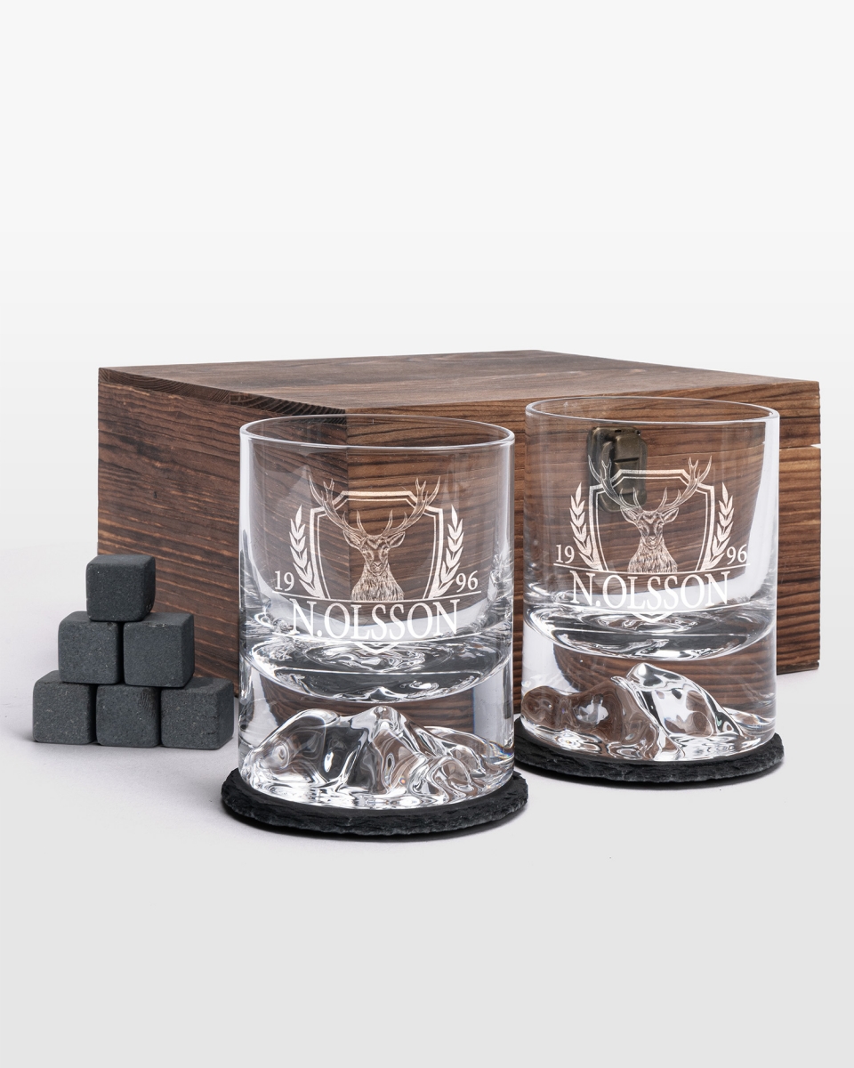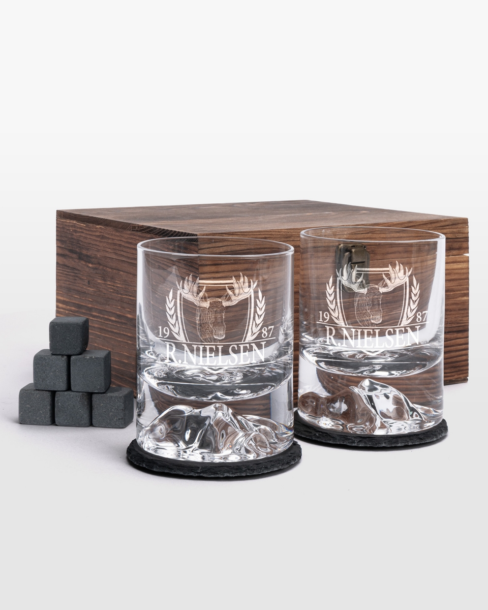 Tämä ylellinen viskisetti toimitetaan käytännöllisessä ja tyylikkäässä puulaatikossa, joka toimii sekä säilytyksessä että tyylikkäänä lahjarasiana. Laatikko sisältää kaksi kauniisti kaiverrettua viskilasia, joista jokainen on personoitu valitsemallasi nimellä ja metsästysaiheella - valitse karhu, metso, hirvi, villisika, kuusipeura tai kala. Kuvioissa on runsaasti yksityiskohtia ja ne antavat laseille yksilöllisen luonteen, joka sopii luontoa rakastavalle herkkusuulle. Viskilasien pohjassa on kauniit vuoriaiheet, jotka antavat laseille erityisen ylellisen tunnelman.