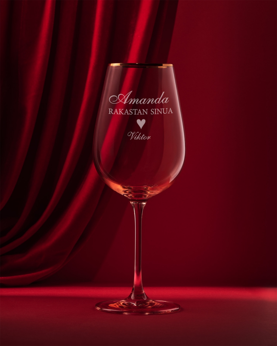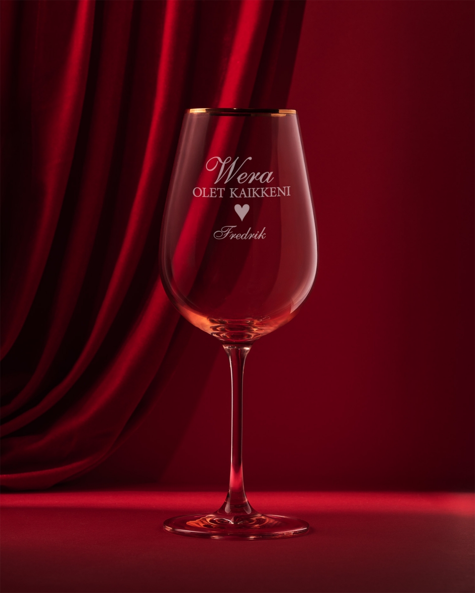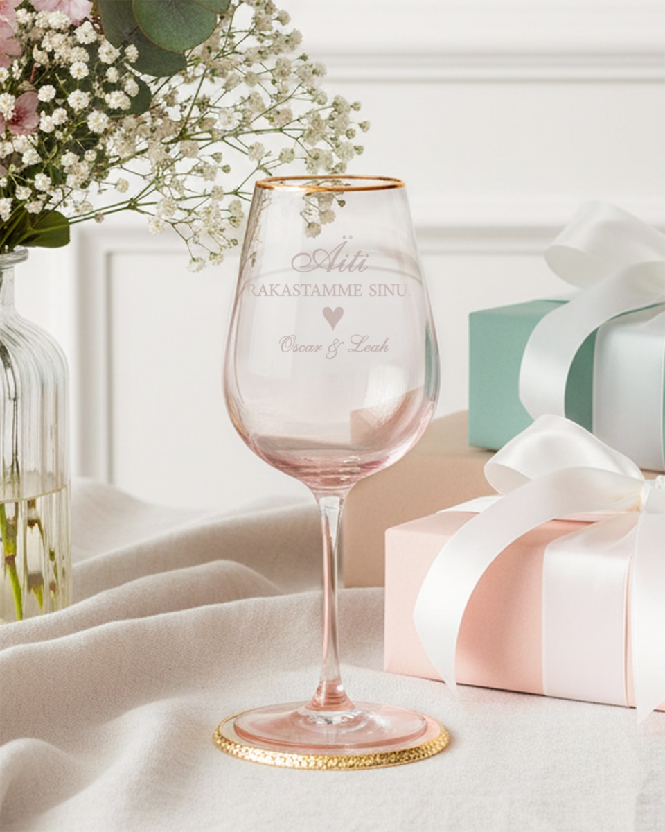 Roosanvärinen viinilasi yksilöllisellä kaiverruksella on hauska ja mieleenpainuva lahja naiselle. Hienot kullanväriset yksityiskohdat ja tyylikäs muotoilu antavat lasille ylellistä ilmettä. Viinilasiin kaiverretaan henkilökohtainen tervehdys ja nimi, joten siitä tulee ainutlaatuinen ja ikimuistoinen lahja.