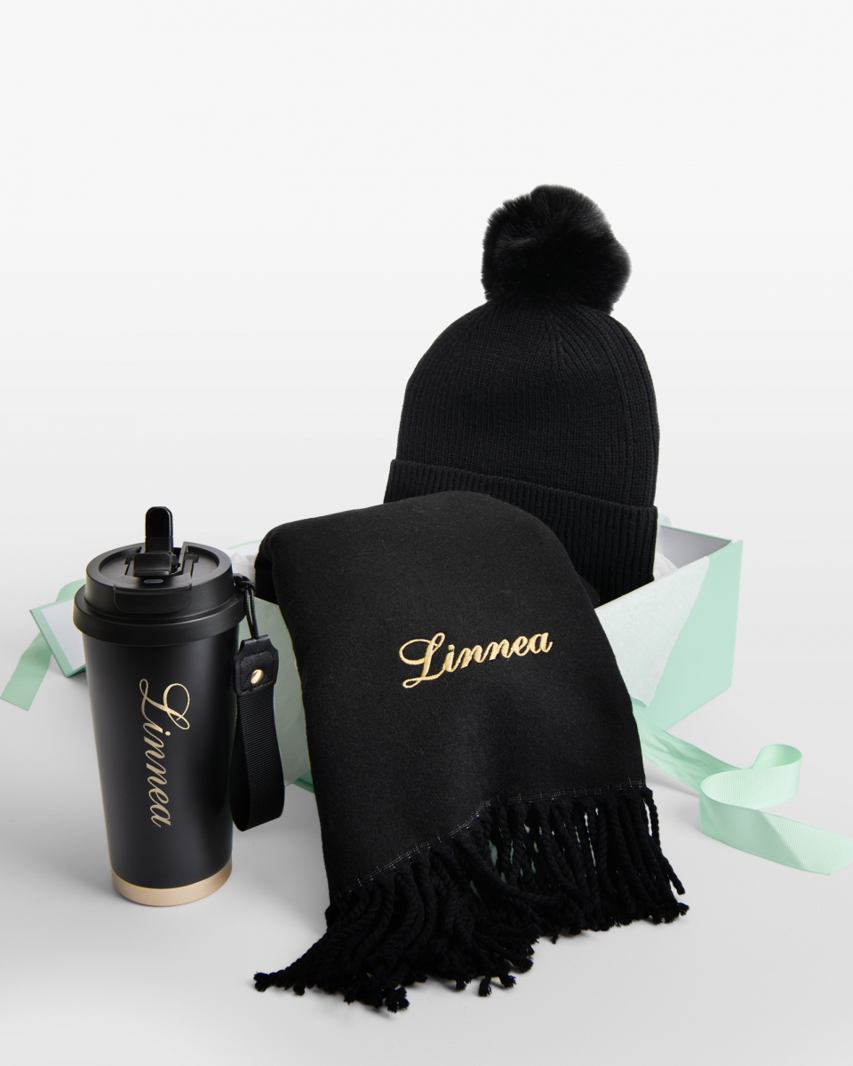 Anna lahjaksi pakkaus, joka lämmittää sisältä ja ulkoa – persoonallinen lahja, jossa yhdistyvät tyyli, mukavuus ja ajatus. Pakkauksessa on pehmeä kaulaliina, jossa on kirjottu nimi, neulepipo ja yksilöllisellä kaiverruksella varustettu termosmuki – kaikki yksityiskohtia, jotka tuovat arkeen ripauksen luksusta.