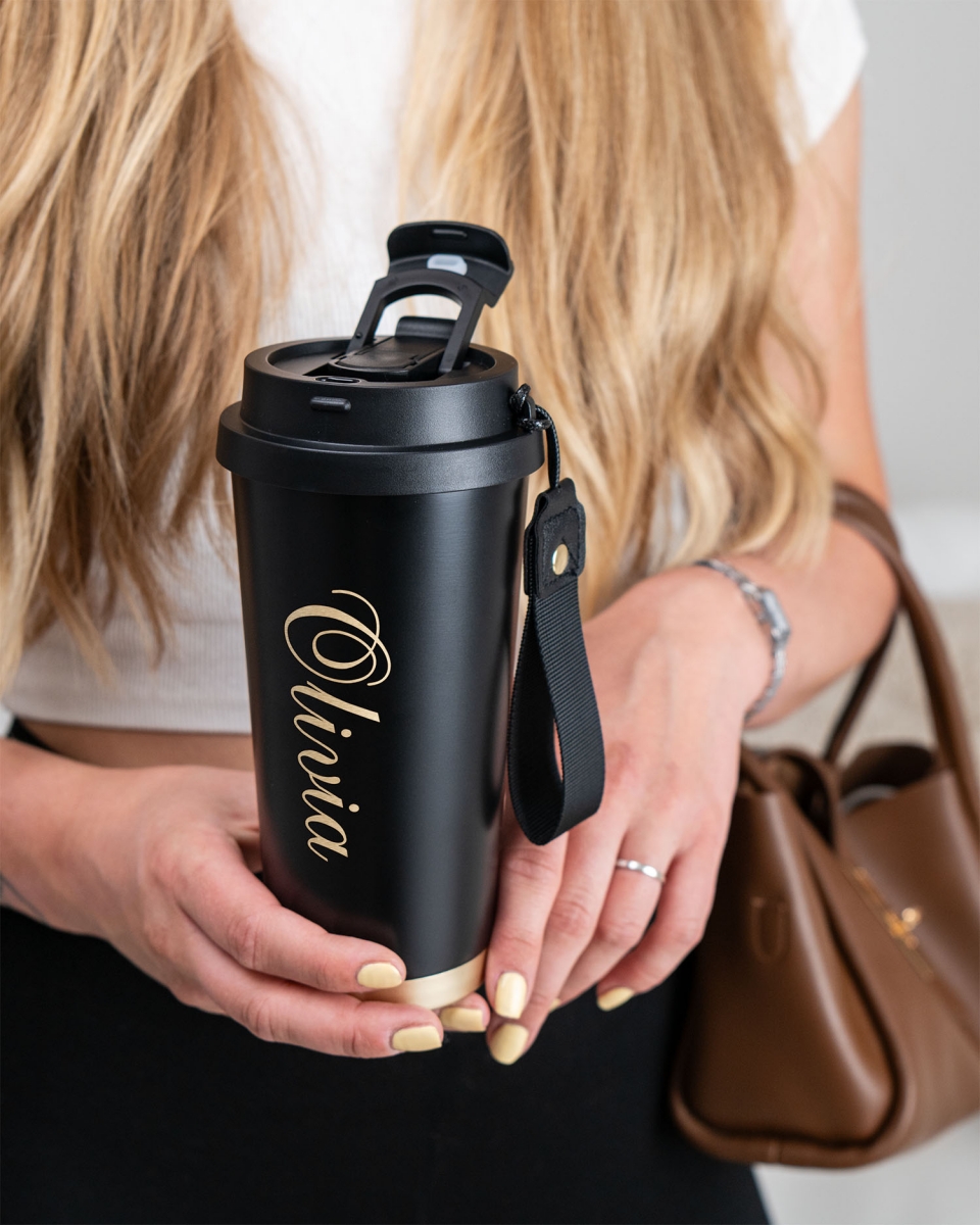 Tästä tyylikkäästä ja nimellä koristellusta termosmukista voit nauttia lempijuomasi kaikkialla. Kun termosmukiin kaiverretaan oma nimesi, siitä tulee ainutlaatuinen ja henkilökohtainen osa arkeasi. Mustassa ja ylellisen kullanvärisillä yksityiskohdilla koristellussa mukissa käytännöllisyys yhdistyy designiin, ja lopputuloksena on kaunis ja kätevä tuote.
