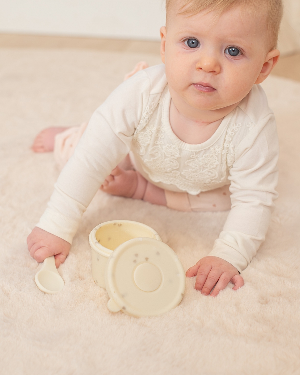 Setti sisältää hienon termospullon, johon kaiverretaan lapsen nimi tai lempinimi – täydellinen pitämään juoman lämpimänä päivän pienten seikkailujen aikana. Mukana on myös söpön ilmapallon muotoinen, pehmeästä silikonista valmistettu tuttipidike, joka pitää tutin lähellä ja puhtaana, sekä ruokailuvälineet, kätevä välipalarasia ja uudelleenkäytettävä välipalapussi – kaikki samassa harmonisessa värisävyssä.