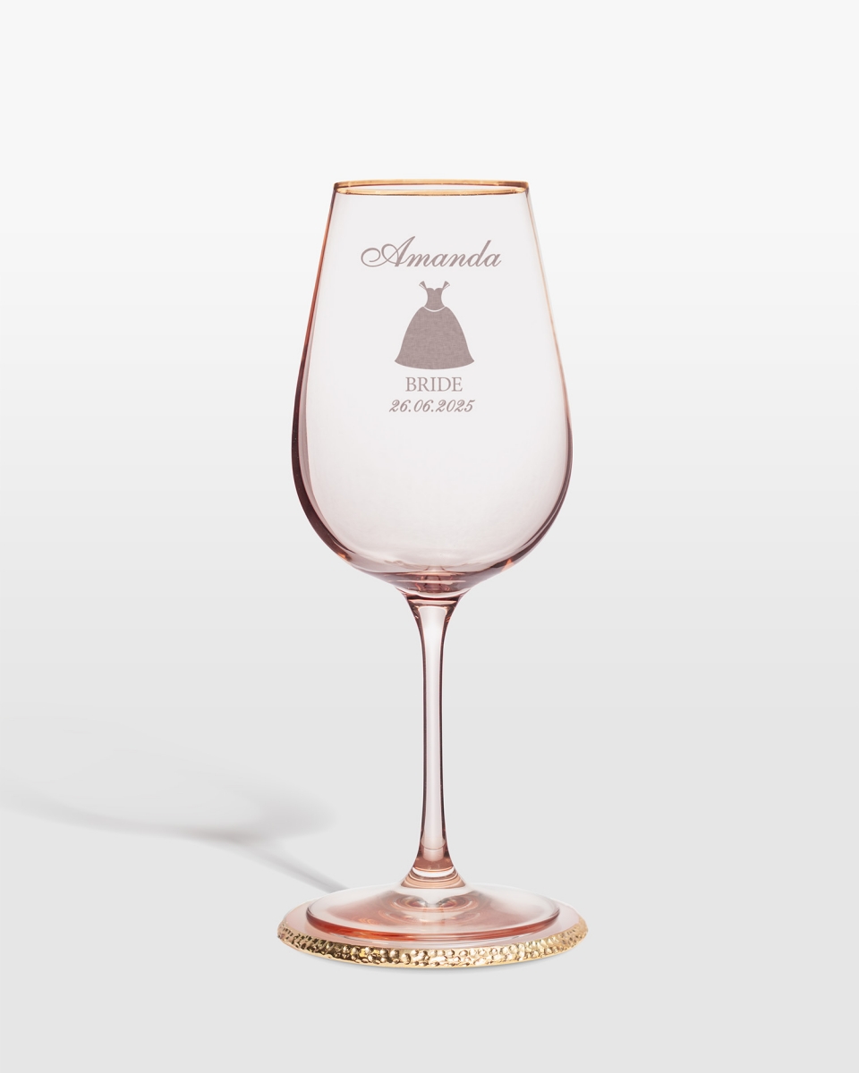 Yksilöllinen, roosanvärinen viinilasi nimellä morsiamelle unohtumatonta päivää varten.