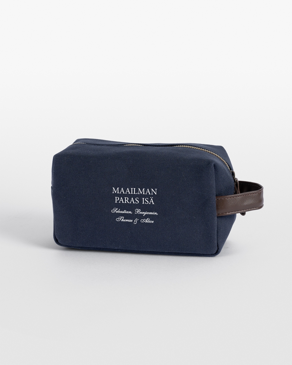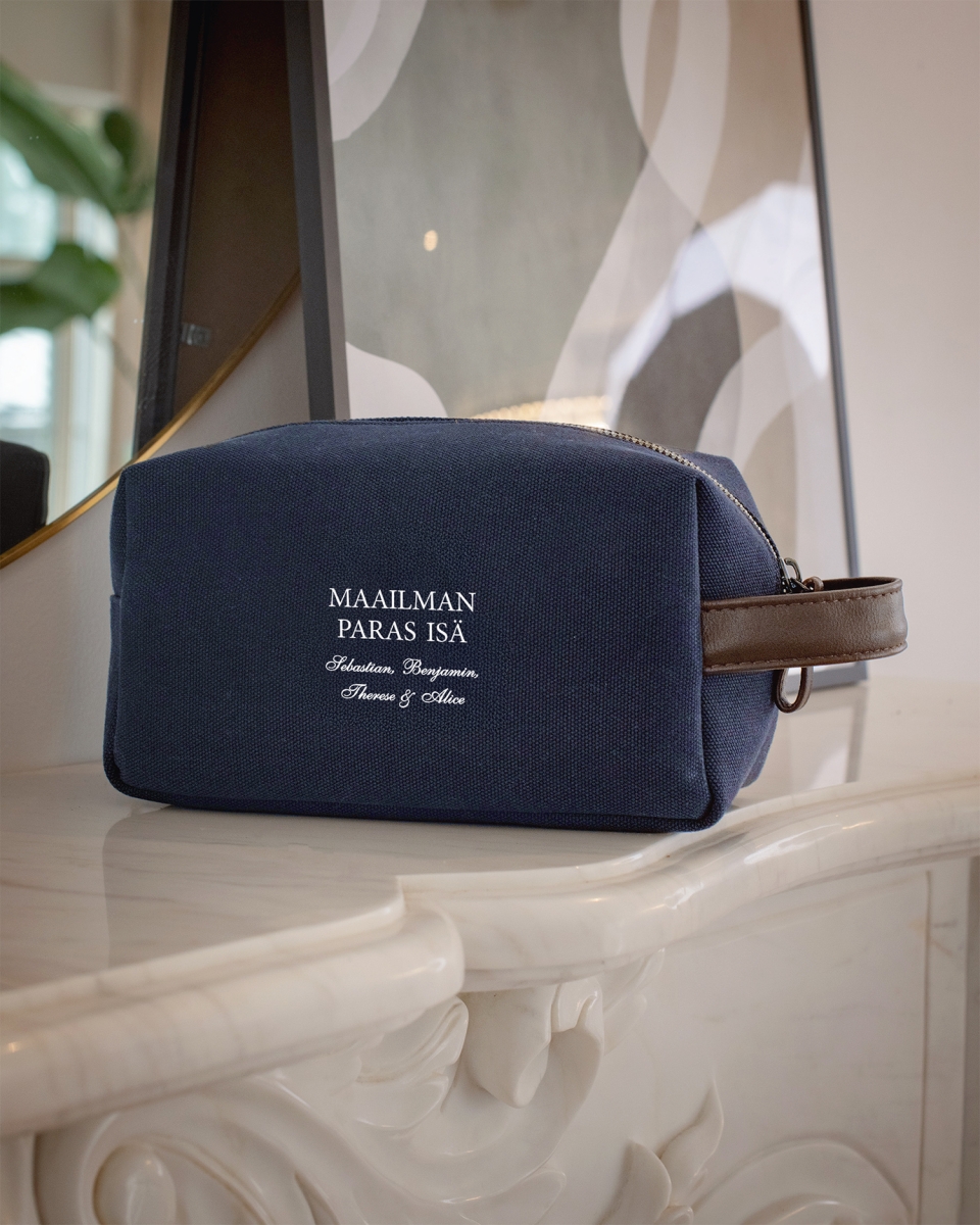 Tästä toilettilaukusta tekee aivan erityisen henkilökohtainen viesti ja nimi, jotka painetaan toilettilaukun kylkeen. Valitset itse toilettilaukkuun haluamasi tekstin, mikä tekee laukusta yksilöllisen ja huomaavaisen isänpäivälahjan isälle.