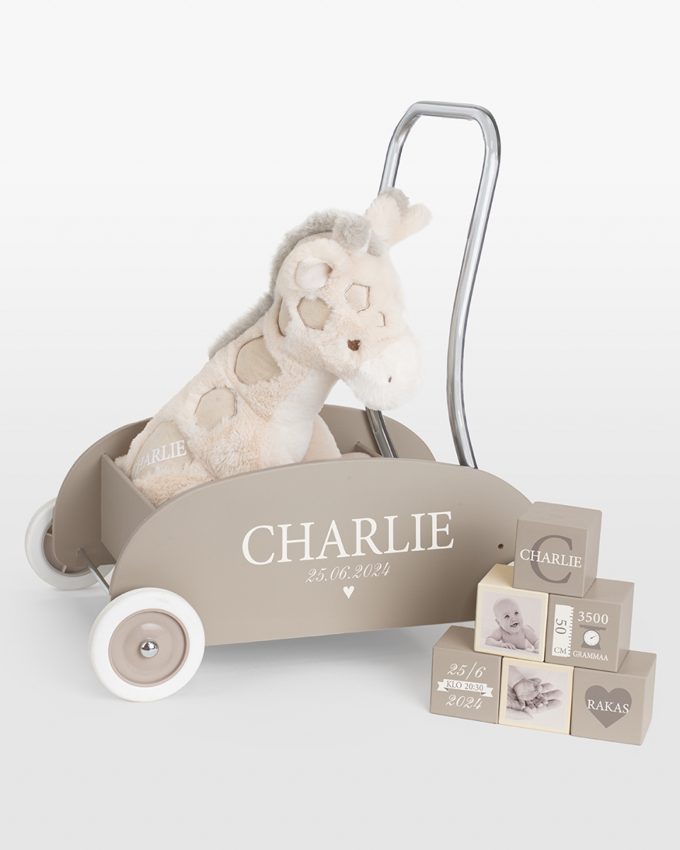 Tämä viehättävä ja yksilöllinen lahjasetti on täydellinen lahja pienokaiselle, joka on juuri alkanut tutustua maailmaan! Setti sisältää ihanan pehmokirahvin, kävelyvaunun ja hauskat puupalikat nimellä.