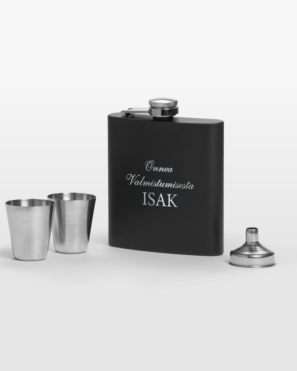 Taskumatin muoto on klassinen ja ajaton, ja se on valmistettu ruostumattomasta teräksestä, jossa on tyylikäs mattamusta viimeistely. Jämäkän muotoilun ja henkilökohtaisen kaiverruksen yhdistelmä luo tyylikkään ilmeen, joka tuntuu todella harkitulta. Lisää nimi, valmistumisvuosi tai lyhyt onnitteluviesti ja luo ainutlaatuinen yksityiskohta, joka korostaa tärkeää virstanpylvästä.