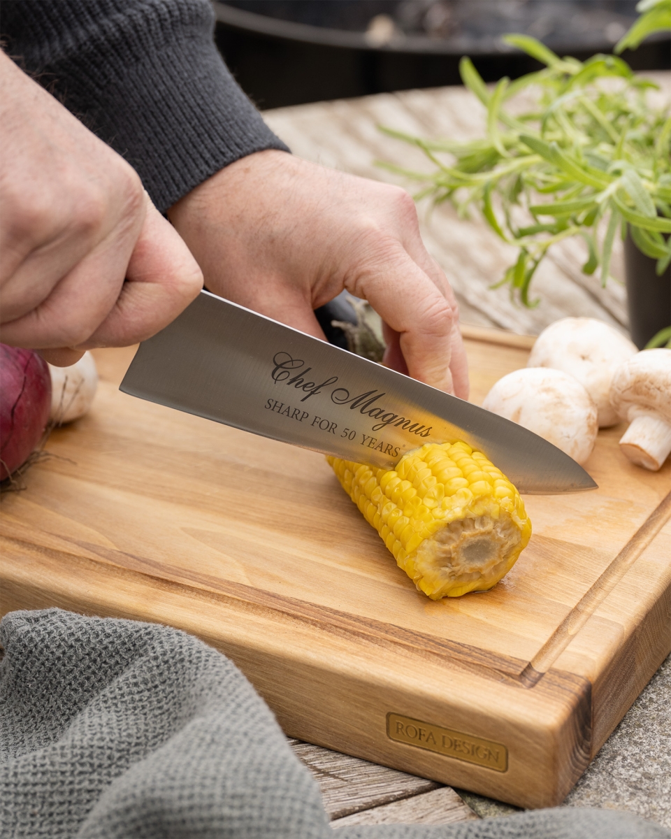 Tämä monipuolinen kokkiveitsi on todellinen moniottelija, joka sopii täydellisesti lihan leikkaamiseen, kasvisten paloitteluun ja kaikenlaiseen ruoan esivalmisteluun. Veitsen tasapaino, tarkkuus ja tyylikäs muotoilu tekevät siitä nopeasti välttämättömän keittiössä. Leikkuulauta nimellä on yksilöllinen ja hieno lisä, jos haluat tehdä kokkiveitsen käyttämisestä vielä erityisemmän elämyksen.