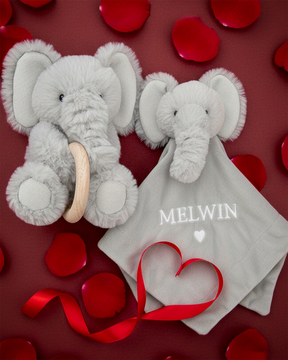 €29 Uniriepu, pehmoeläin pururenkaalla & vauvan viltti nimellä, harmaa – Elefantti