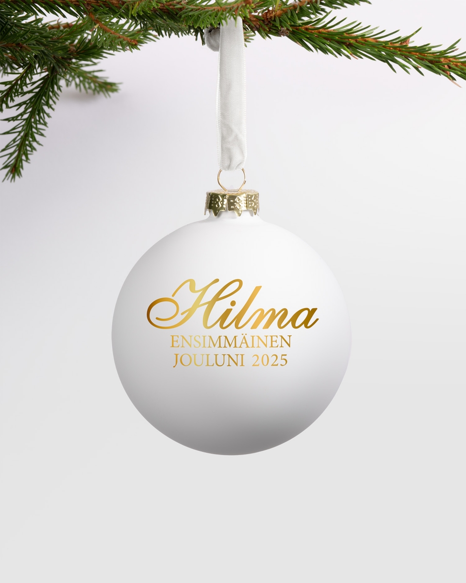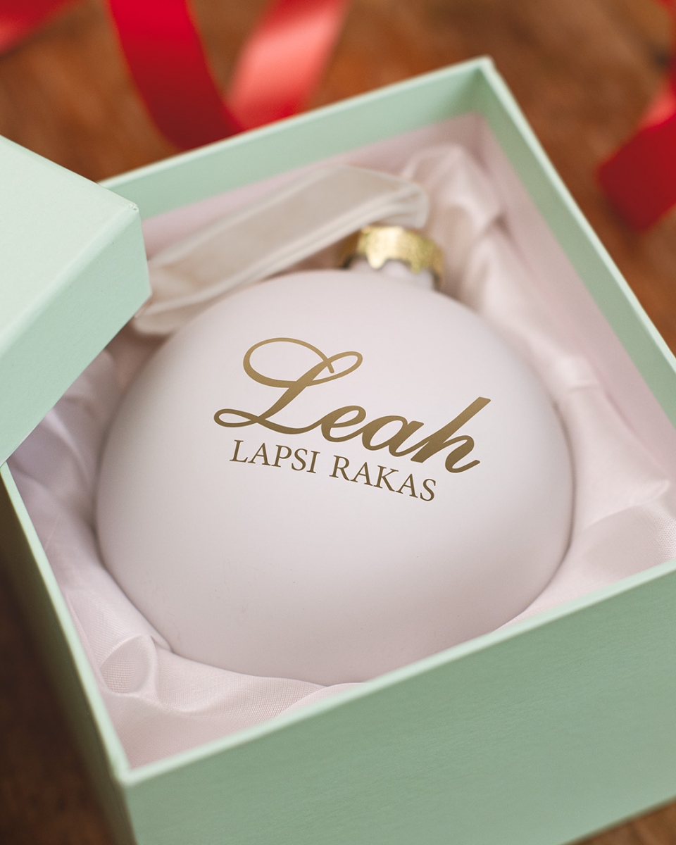 Tämä kaunis joulupallo nimellä ei ole pelkästään sisustuksen koristeellinen yksityiskohta, vaan siitä tulee rakas muisto, jota säilytetään tulevia jouluja varten. Valitset itse joulupalloon kaiverrettavan viestin ja nimen, mikä tekee pallosta erityisen henkilökohtaisen.