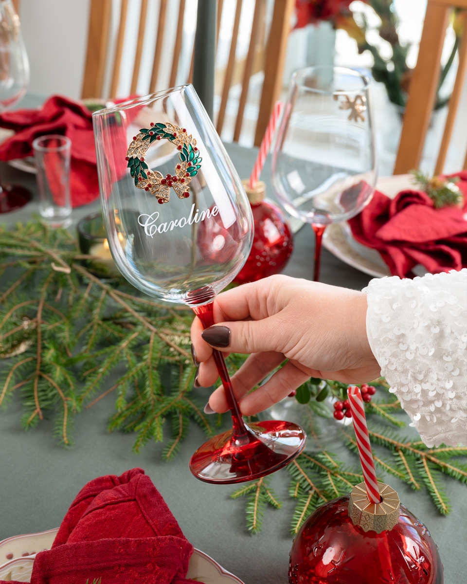 Anna joulun tulla tällä yksilöllisellä viinilasilla, johon kaiverretaan valitsemasi nimi. Tehdäksemme viinilasista aivan erityisen olemme koristelleet sen kauniilla joulukranssilla ja strasseilla, jotka yhdessä syvänpunaisen jalan kanssa luovat parasta joulutunnelmaa kotiisi.