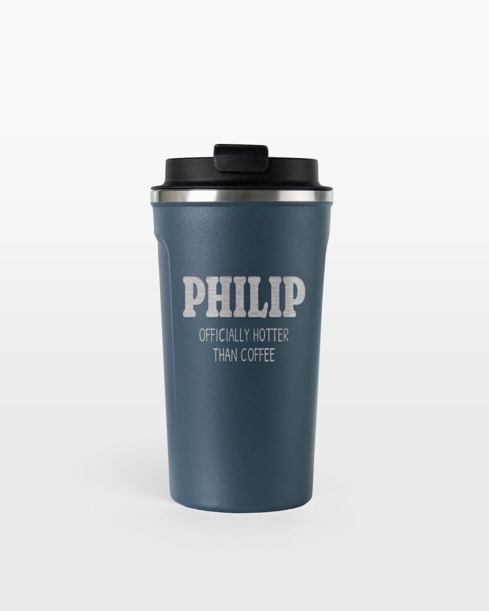 Anna jotain, jota oikeasti voi käyttää: sininen termosmuki, jossa on henkilökohtainen kaiverrus. Voit valita nimen ja viestin - poskettoman, hauskan tai inspiroivan - jotakin, joka sopii miehelle, joka tarvitsee hieman lisäpuhtia askeleeseensa, tai joka vain pitää lahjasta, jossa on asennetta.