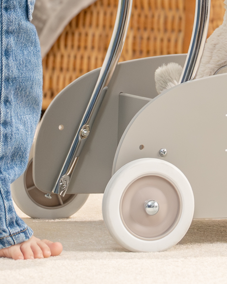 Hiekanharmaa tyylikäs kävelyvaunu on kaunis ja käytännöllinen. Kävelyvaunun vankka rakenne tarjoaa turvaa ja tukea pienille jaloille, kun lapsi alkaa tutkia maailmaa.