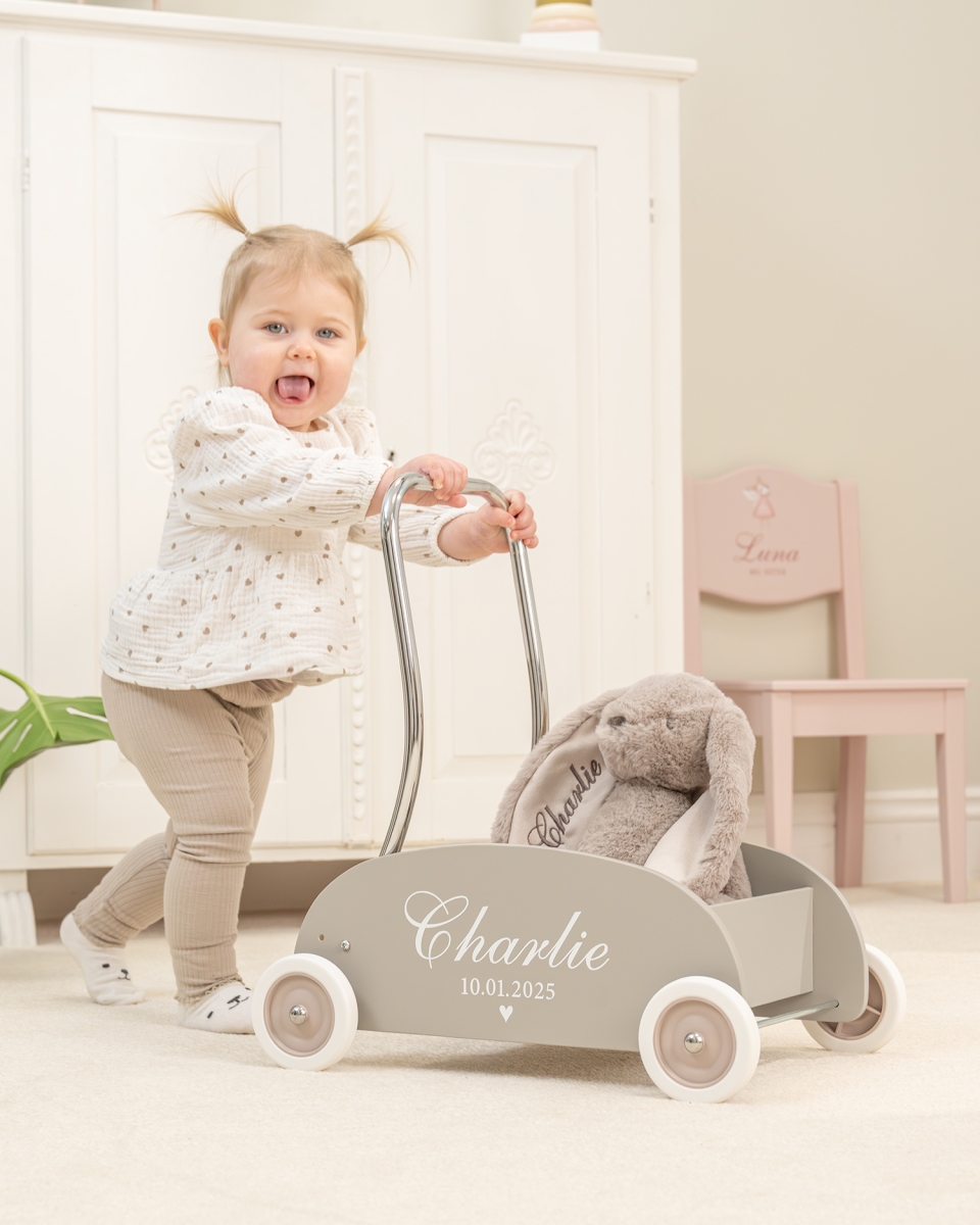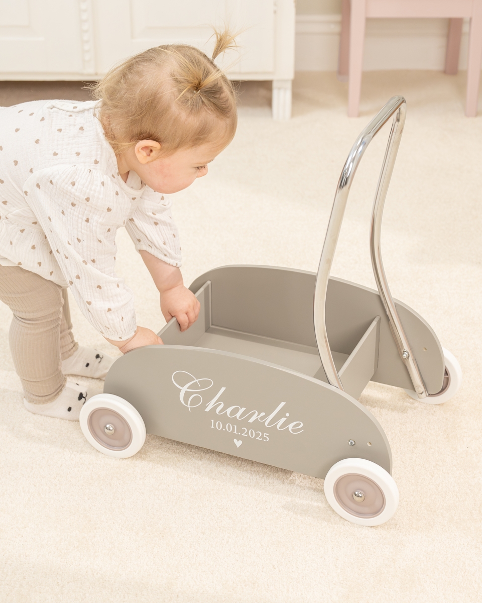 Kävelyvaunuun lisätään lapsen nimi ja syntymäaika, mikä tekee siitä ainutlaatuisen ja ikimuistoisen lahjan. Kävelyvaunu tukee lapsen kehitystä ja säilyy samalla muistoesineenä merkittävästä virstanpylväästä lapsen elämässä.