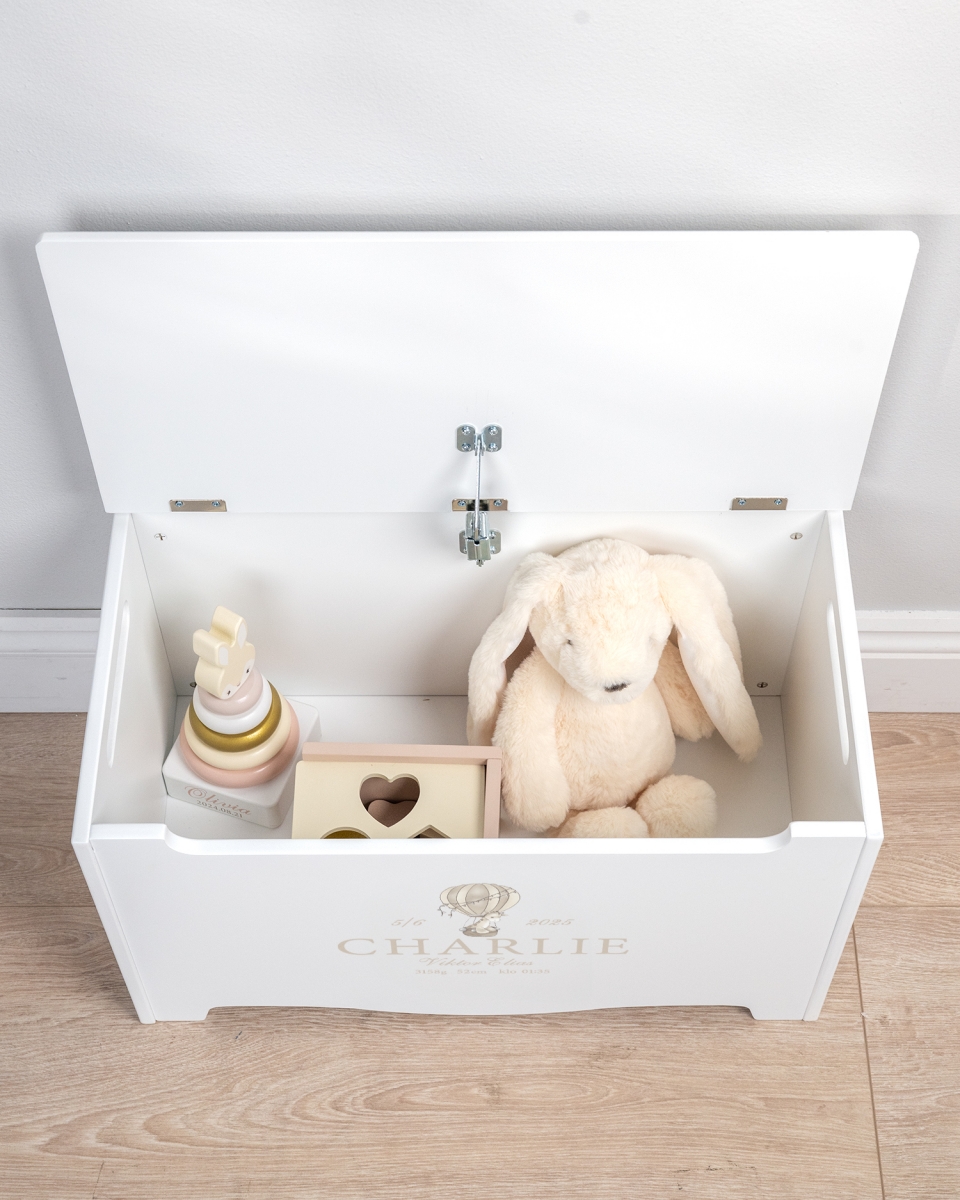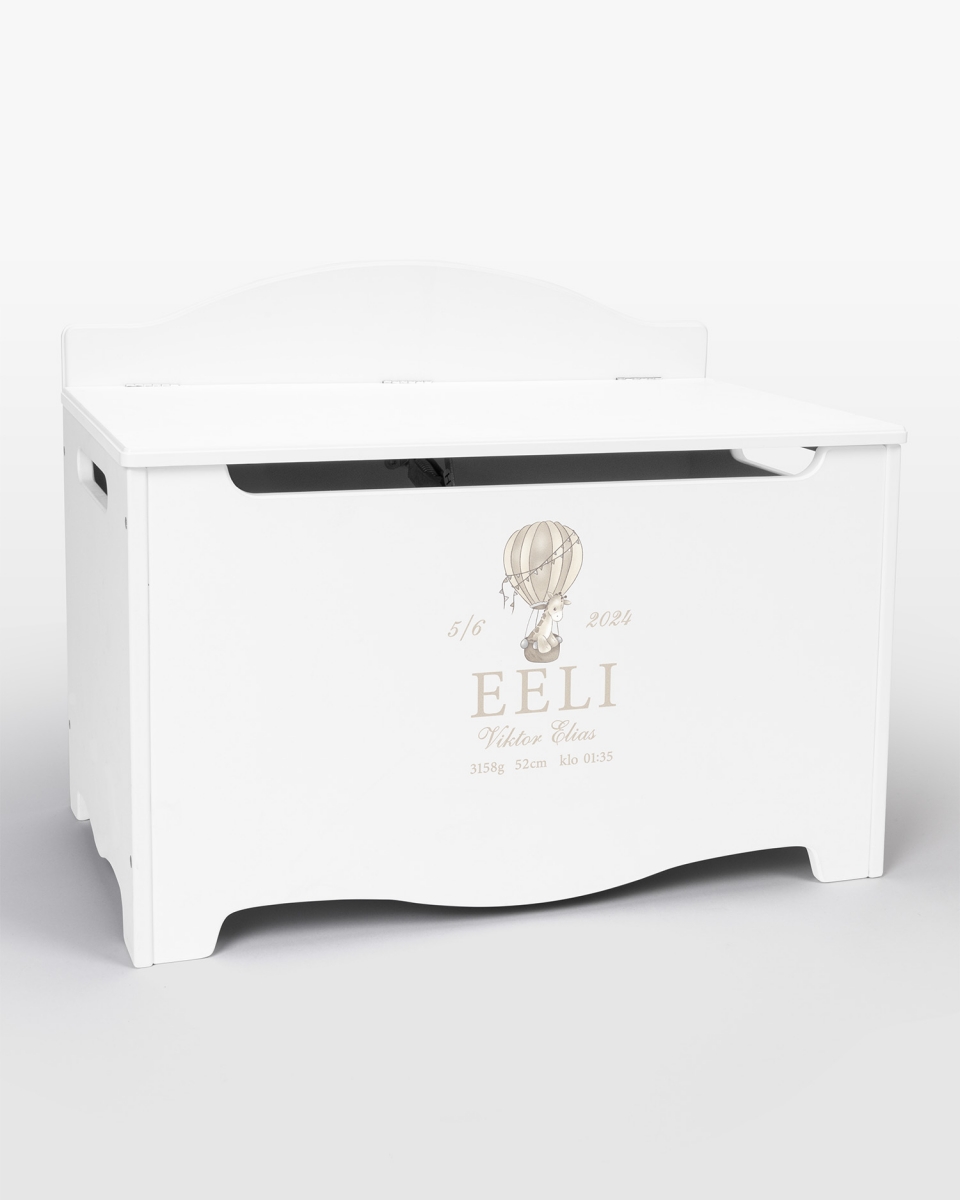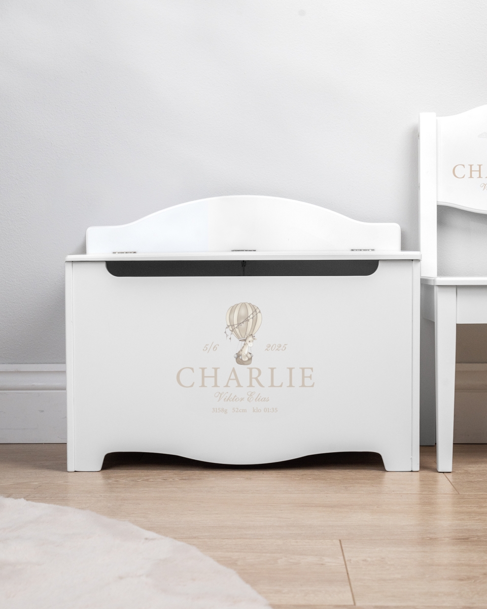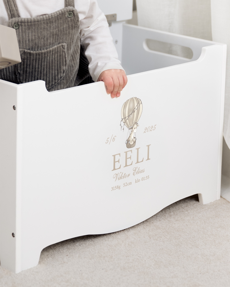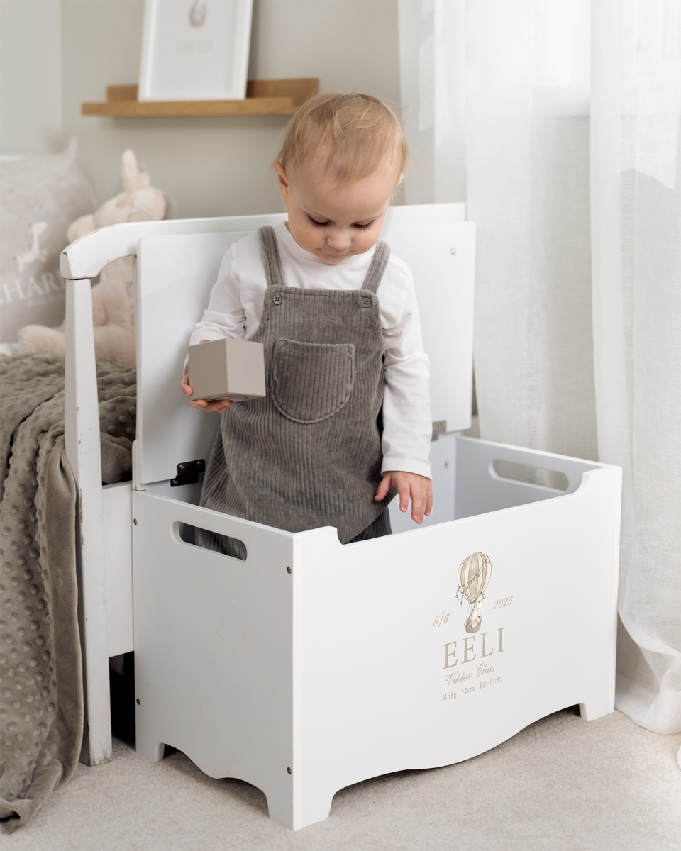 Denna charmiga förvaringskista med namn är en perfekt present för dop eller andra speciella tillfällen. Den är inte bara praktisk, utan också en unik inredningsdetalj i barnrummet.