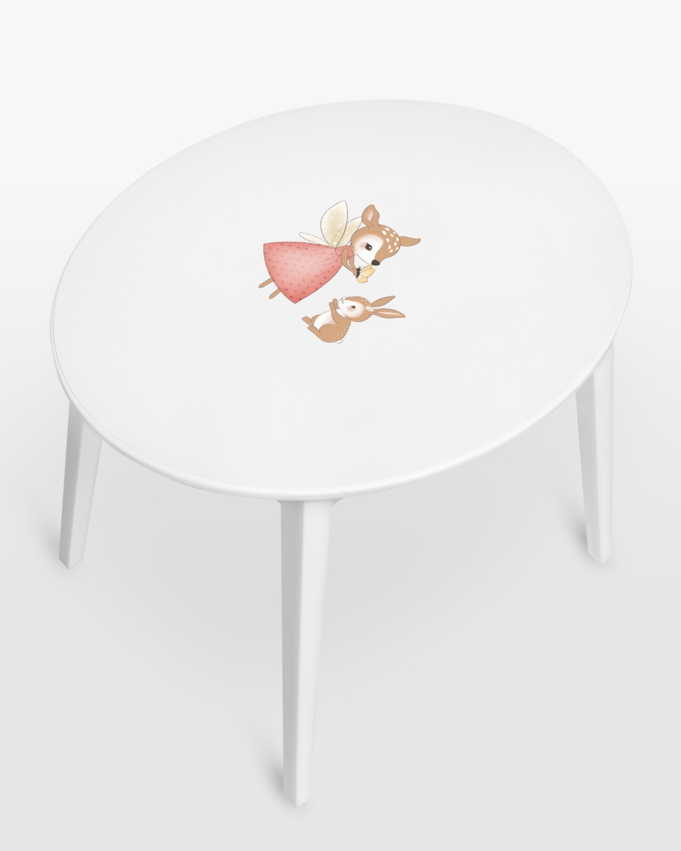 Luo paikka mielikuvitukselle tällä viehättävällä lastenkalustesetillä – yksilöllinen ja viihtyisä nurkkaus leikkiä, luovuutta ja haaveita varten. Kalustesetti sisältää tukevan pöydän ja kaksi sen kanssa yhteensopivaa tuolia, joissa on kaunis ja sydäntälämmittävä Rut-kauriskeijun kuva – pieni ystävä suurella sydämellä.
