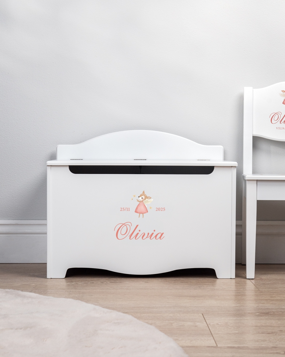 Luo lastenhuoneeseen ripaus taikaa ja järjestystä tällä upealla säilytysarkulla, joka pitää lelut ja kirjat järjestyksessä ja josta tulee osa lapsen omaa mielikuvitusmaailmaa. Kaunista arkkua koristaa viehättävä kuva Rut-kauriskeijusta, joka on leikkisä ja tarunhohtoinen hahmo Nordic Deer -kokoelmastamme. Rut-kauriin lempeän taianomainen olemus luo huoneeseen turvallista, lämmintä ja seikkailuhenkistä tunnelmaa.