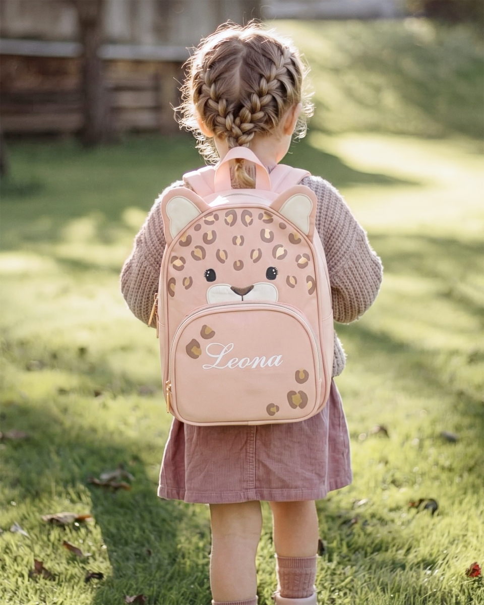 Upea nimellä varustettu lasten leopardin muotoinen reppu. Tämän pienen puuteriroosan värisen repun lapsi ottaa mielellään mukaan kaikkialle. Leopardin kauniit ja kimaltelevat täplät antavat repulle leikkisän ja ainutlaatuisen ilmeen.