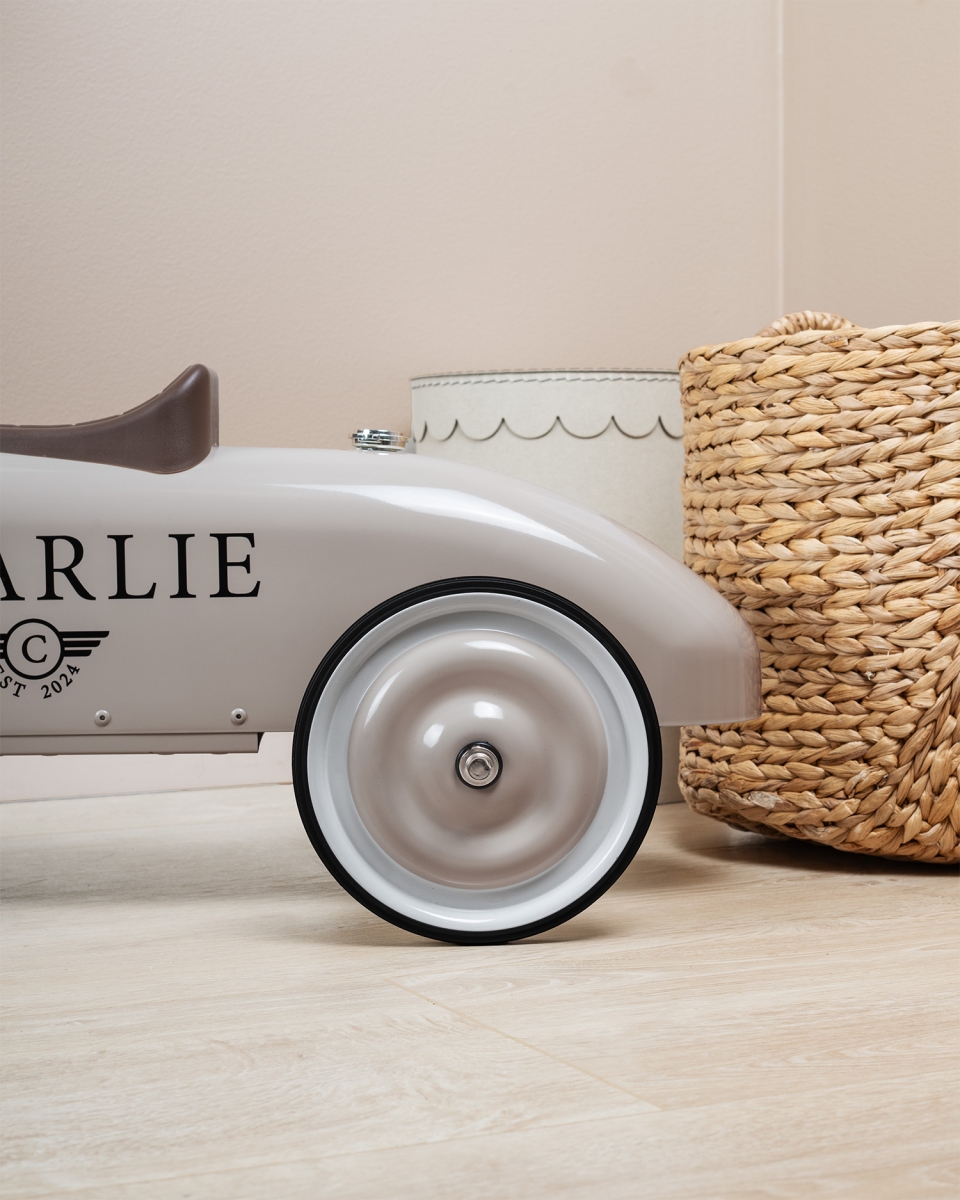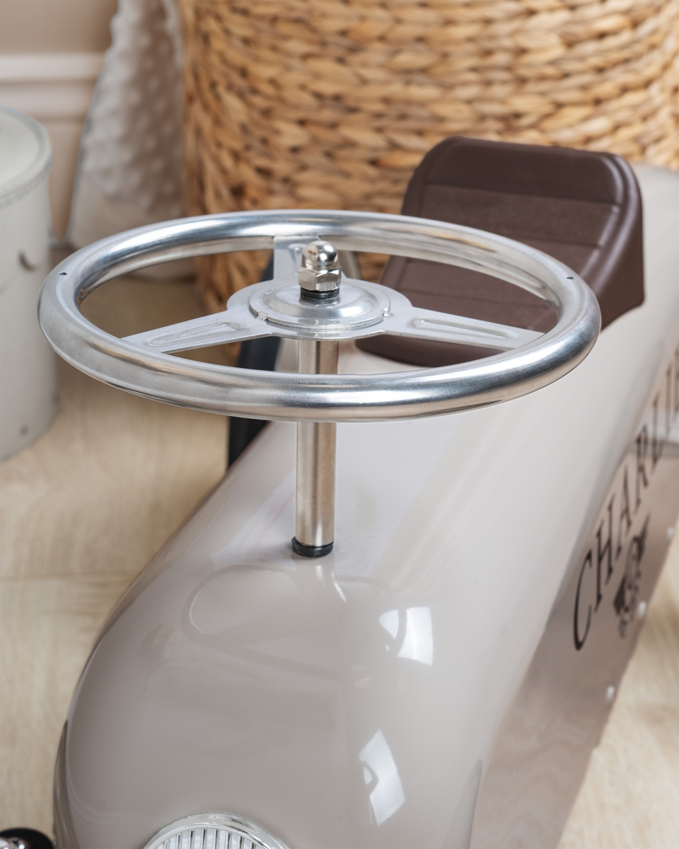 Metallilevystä valmistetussa potkuautossa on kumirenkaat ja metallinen ohjauspyörä, josta on helppo pitää kiinni.