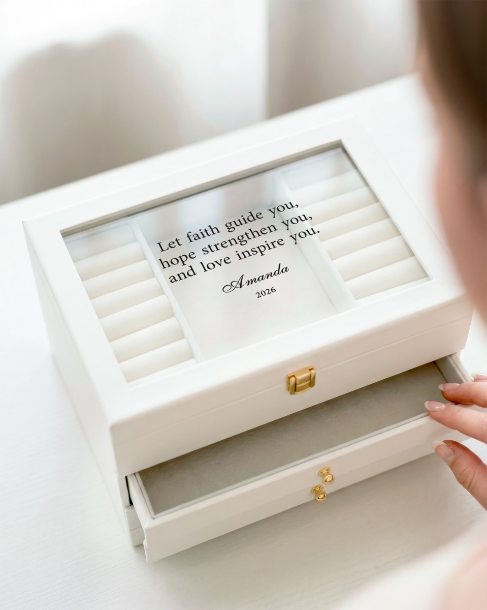 €90Lasinen muistolaatikko kaiverruksella – Pristine
