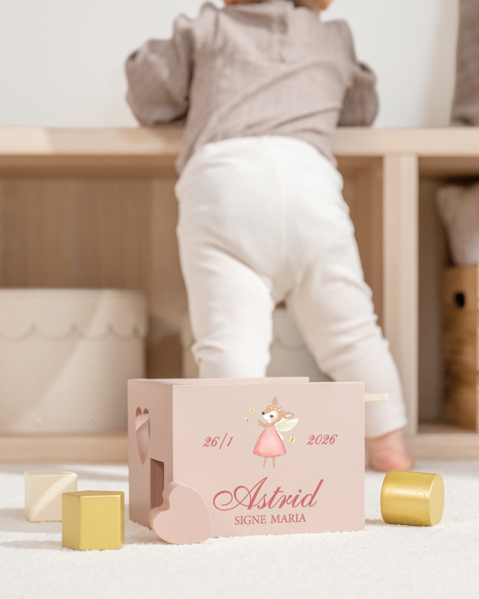 Nimellä koristeltu palikkalaatikko on taianomainen ja persoonallinen lahja Nordic Deer -kokoelmastamme.